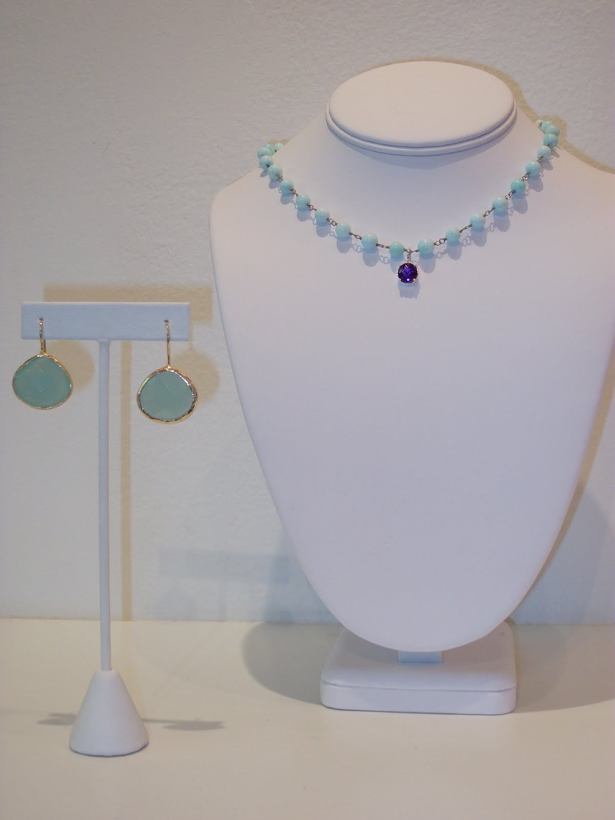 Quartz and vermeil necklace $350 – Quartz and vermeil earrings $200 – Acrylic and Swarovski crystal earrings $130